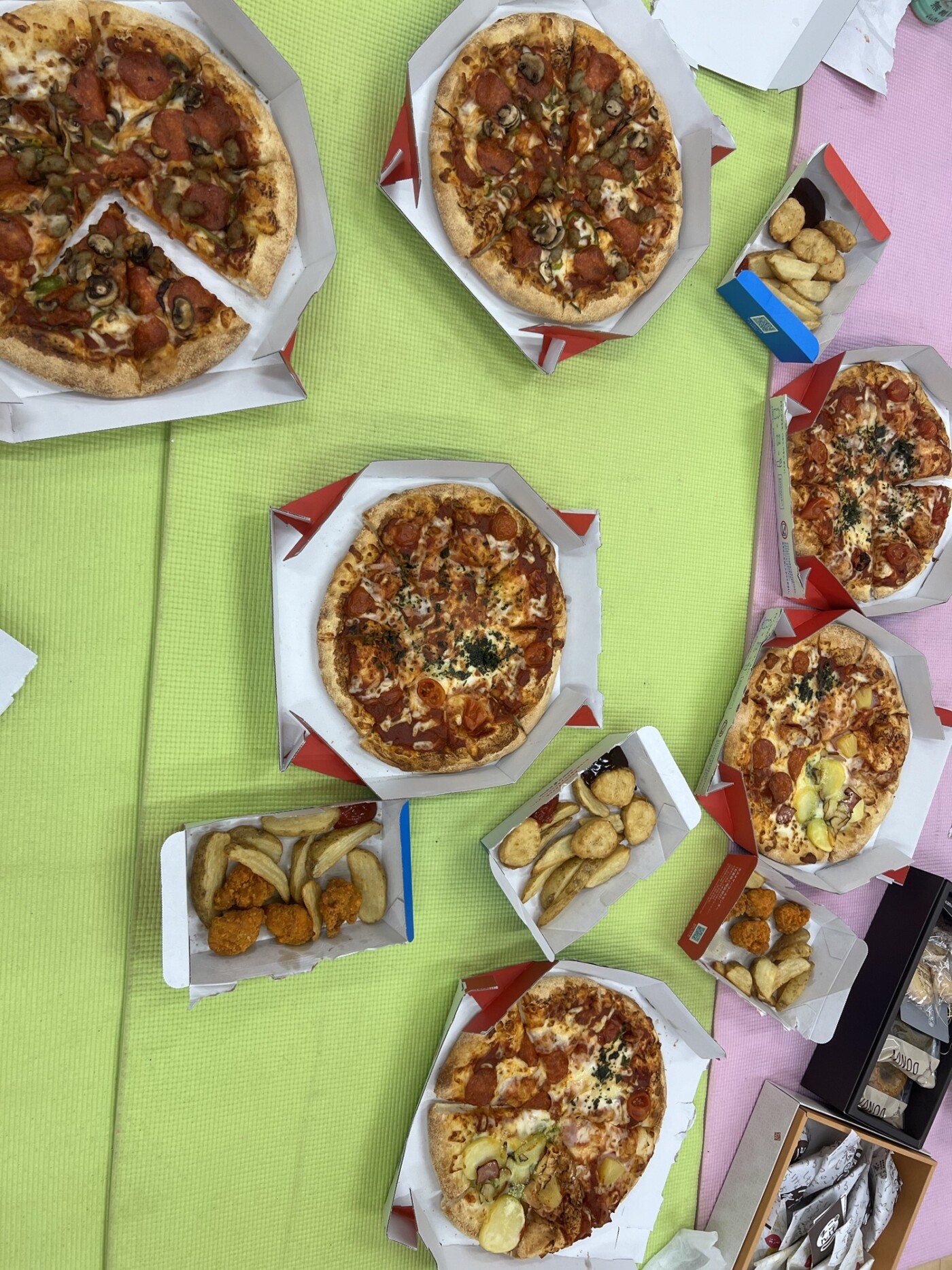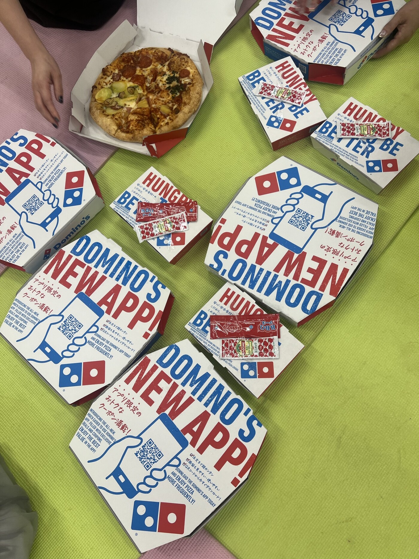 打ち上げスタジオでピザ🍕と箱の写真撮って、