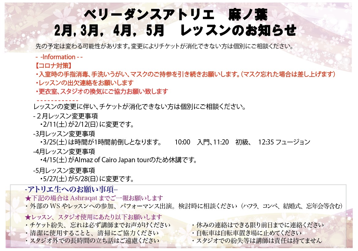 麻ノ葉info【 2月,3月,4月,5月 レッスンのお知らせ】