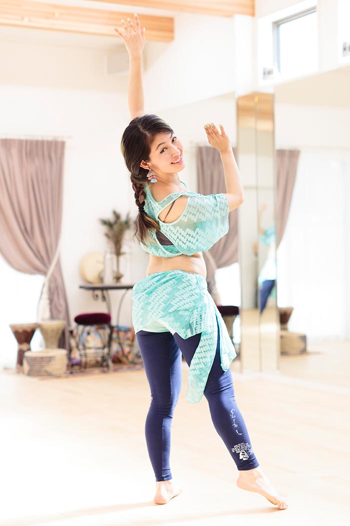 レッスンを行う上で大切にしていることは、表面にとらわれず、身体の芯を意識していくということと「楽しい」という気持ちを大切にすること。「とりあえず」ベリーダンスの動きができるようになるところを目指すのではなく身体の動かしやすい位置、楽な位置、綺麗に見える位置を第一にしその上で飾りをつけていくイメージ。自分自身が全くダンスの基礎がなかったことからの反省もある。(もちろん今も学びの途中)。そうでないと、本質的な美しさは手に入らないしダンスをして身体を痛めては、本末転倒であるから。