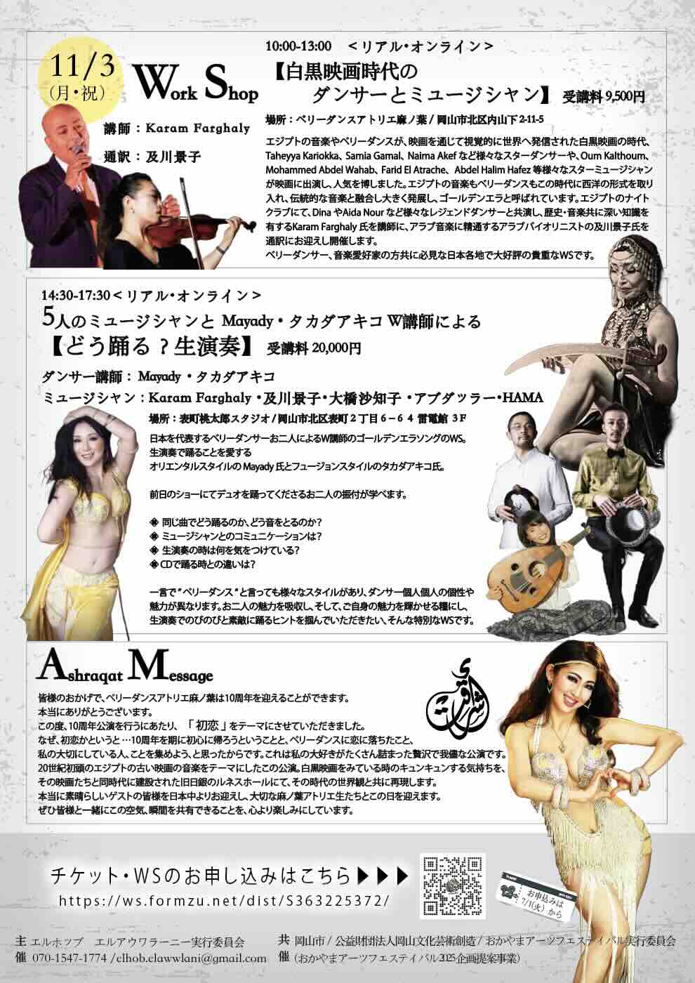 エジプトのナイトクラブにて、DinaやAida Nourなど様々なレジェンドダンサーと共演し、歴史・音楽共に深い知識を有するKaram Farghaly 氏を講師に、アラブ音楽に精通するアラブバイオリニストの及川景子氏を通訳にお迎えし開催します。