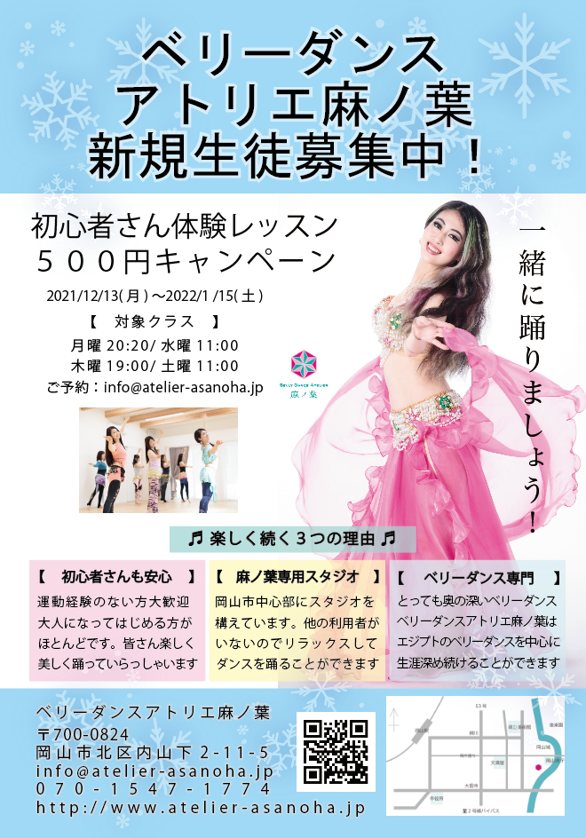 ベリーダンスアトリエ麻ノ葉では体験レッスンキャンペーン開催☃️ 通常1100円のレッスン体験が今年中は500円で体験できます🫶 新曲が始まるこの機会にぜひ✨ 【 🔰初心者さん向けクラス🔰 】 ・火曜日 […]